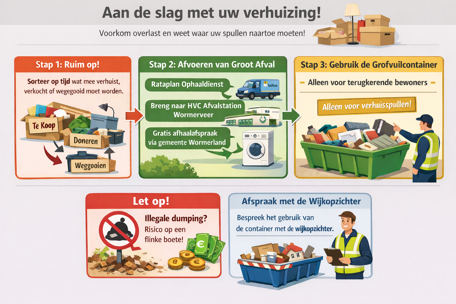 We adviseren bewoners om al ruim vóór de verhuizing in te schatten welke spullen wel en niet meeverhuizen naar de nieuwe woning. Zo heeft u voldoende tijd om overbodige spullen weg te doen, te verkopen, te doneren of af te laten voeren. Dit helpt om de verhuizing overzichtelijk te houden en voorkomt dat er op het laatste moment veel afval in de wijk ontstaat.