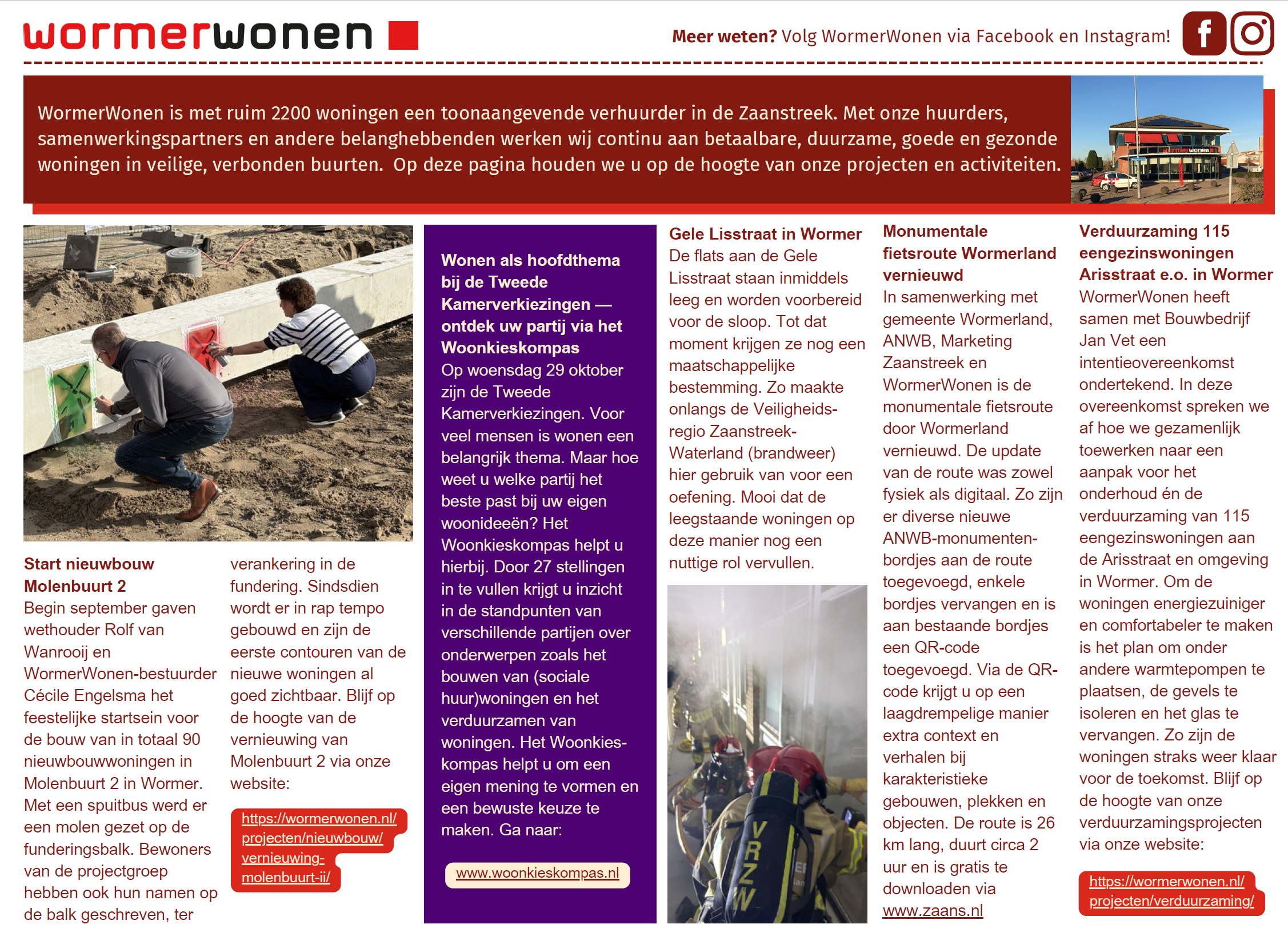 Daarnaast leest u in het overzicht over onze verduurzamingsplannen voor de Arisstraat e.o. in Wormer, waar we samen met bewoners werken aan comfortabelere en energiezuinigere woningen. Ook besteden we aandacht aan de vernieuwing van de monumentale fietsroute in Wormerland, zodat dit mooie stukje geschiedenis behouden blijft voor de toekomst. Tot slot nemen we u mee naar de Gele Lisstraatflats, die momenteel leegstaan en binnenkort worden gesloopt. Voordat het zover is, krijgt de locatie nog een maatschappelijke bestemming: de brandweer houdt er een oefening om hun vaardigheden in de praktijk te trainen.